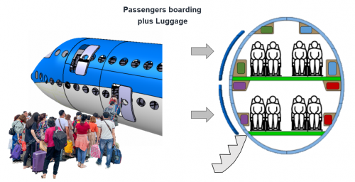 Hybrid aircraft were chosen long ago: passengers on deck and cargo and baggage below deck in the hold. This decision by the designers has resulted in the air transport system for passengers becoming unnecessarily complicated. Two (2) hours before boarding, passengers check in their checked baggage at the airport. Then, a long wait before boarding. Meanwhile, the suitcases and cargo containers must be stowed in the aircraft hold by loaders under favorable working conditions. Then, the aircraft can take off and fly to its destination. After landing, the suitcases must be returned before the journey to its final destination can continue.